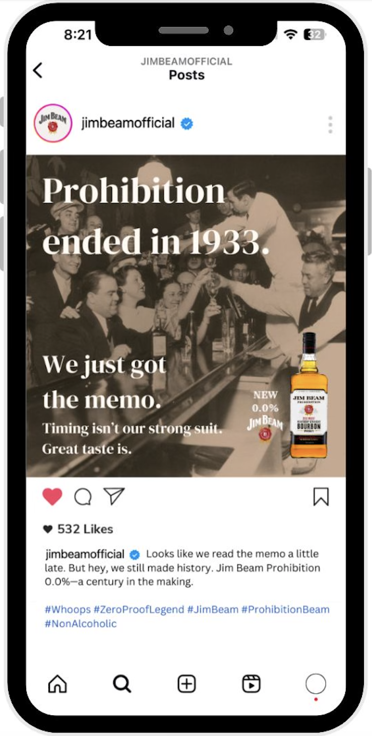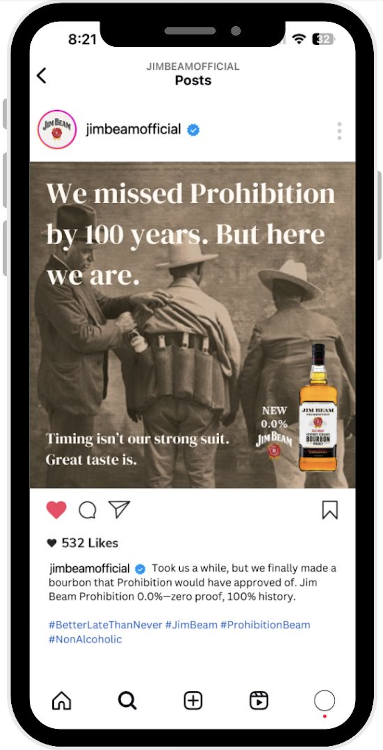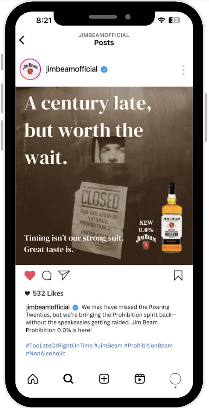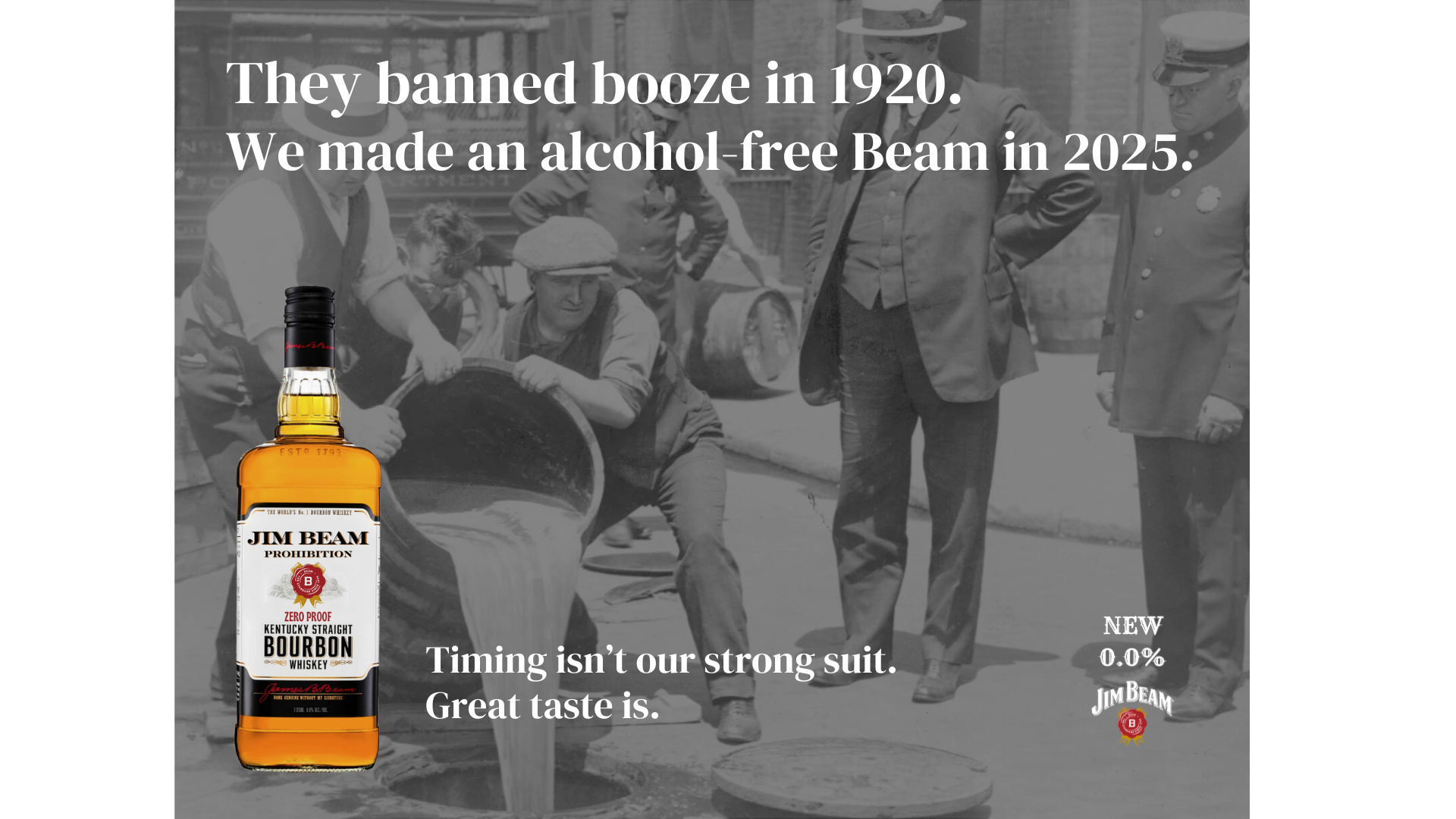 Insight: This campaign uses humor and irony to highlight the absurdity of releasing an alcohol-free bourbon a century after Prohibition. The vintage imagery and “bad timing” theme make it fun, self-aware, and a clever nod to Jim Beam’s long history.