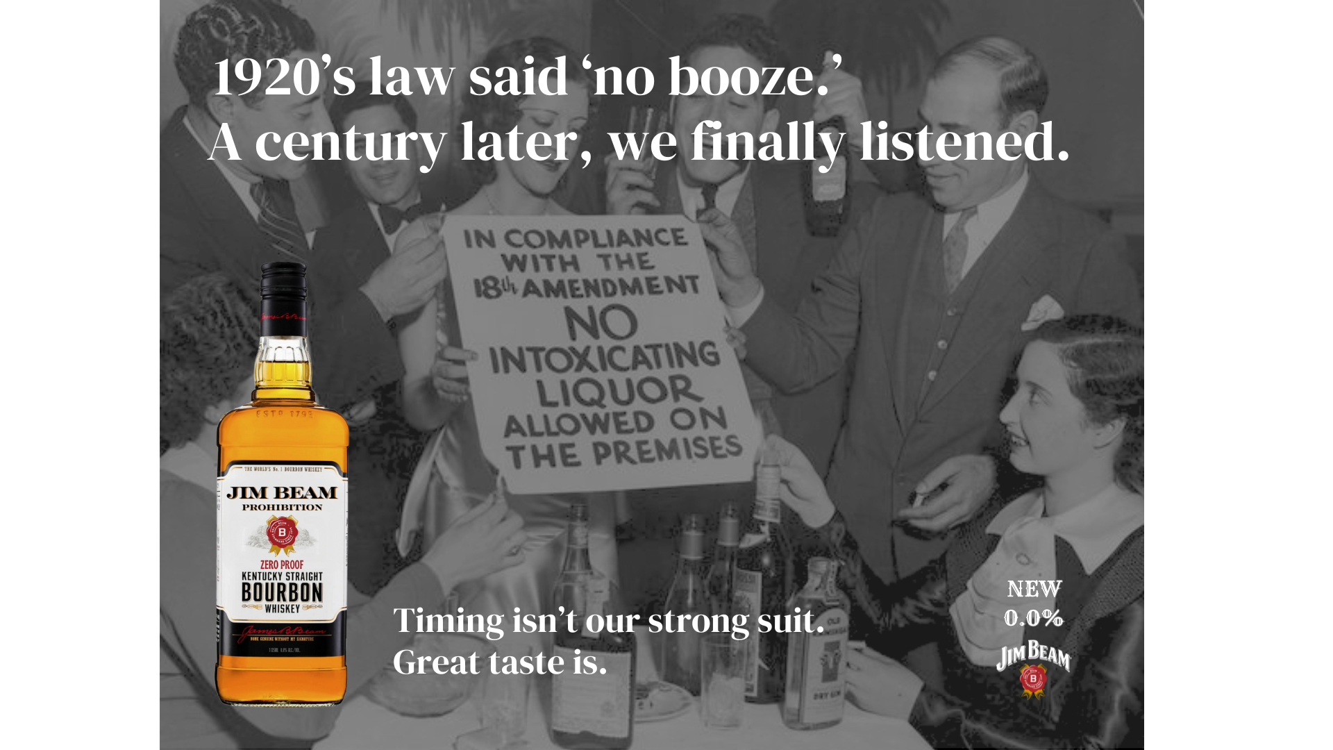 Campaign: Jim Beam Prohibition 0.0%—the perfect Prohibition whiskey… just 100 years too late.